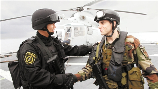当地时间2月13日,中国海军第十八批护航编队运城舰与法国海军“比罗司令”号导弹护卫舰在法国土伦港外耶尔湾进行联合演练。演练主要围绕海上意外相遇、通信操演、临检拿捕、救治转运伤员等五项内容展开。图为双方参演队员在联合演练中进行友好交流。 新华社发(廖宇飞 摄) |