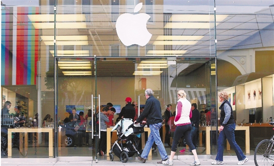 在美国旧金山,顾客们进入一家苹果零售店。 新华社发