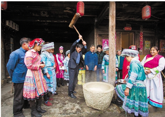 2月16日中午,新昌县镜岭镇外婆坑村11个民族的100多位村民,齐聚一堂吃年夜饭,浓浓年味弥漫山村。图为团圆饭前,村民们在打糍粑。 孙艺秋 陈佳莹 梁柏林 摄