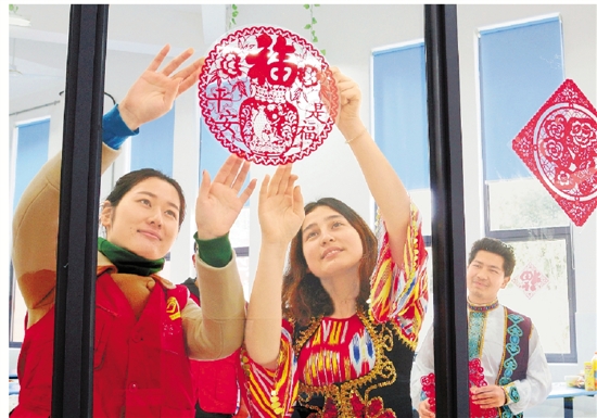 大年三十,宁波北仑区团委和教育局组织志愿者,与500余名在北仑的新疆内地高中班同学一起贴窗花、包水饺,让内高班的同学们体验不一样的年俗。 江增辉 索向鲁 丁谨之 摄