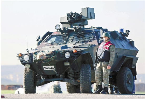 2月22日,在叙利亚境内,一名土耳其士兵在行动中站在装甲车旁。 新华社发