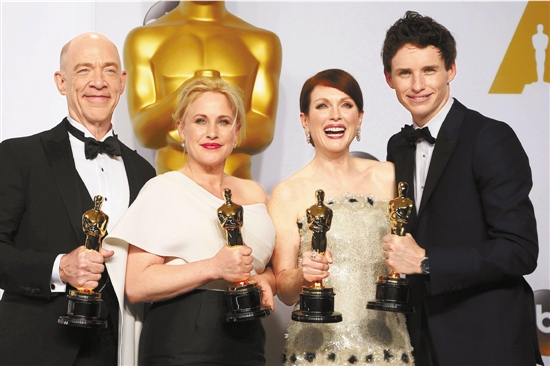 2月22日,在美国洛杉矶杜比剧院,埃迪·雷德梅因、朱莉安·摩尔、帕特丽夏·阿凯特和J·K·西蒙斯(从右至左)在获奖后合影。 新华社发