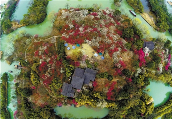 2月22日,航拍西溪梅墅盛开的梅花。杭城三大赏梅胜地之一的西溪国家湿地公园中,寻梅探春的游客纷至沓来,徒步或泛舟观赏30余个品种近两万株各色梅花。 本报记者 梁臻 通讯员 戴小丽 摄