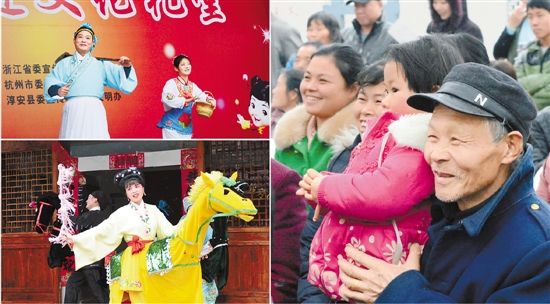 2月25日,淳安县千岛湖镇富泽村和枫树岭镇下姜村的村民,与送戏下乡的演员一起,表演以“两美”建设为主题的文艺节目。 本报记者 黄曙林 摄