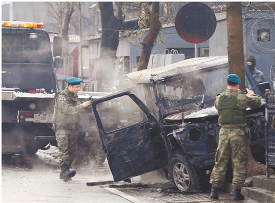 2月26日,在阿富汗首都喀布尔,土耳其士兵在自杀式爆炸袭击现场拍照取证。