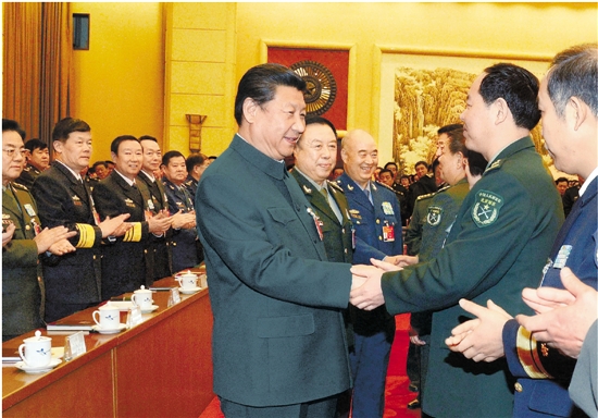 3月12日,习近平出席十二届全国人大三次会议解放军代表团全体会议并发表重要讲话。这是习近平同军队人大代表亲切握手。 新华社记者 李刚 摄