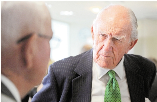3月20日,澳大利亚前总理马尔科姆·弗雷泽办公室发表声明宣布,弗雷泽于当日早晨去世,享年84岁。这是2010年3月4日在澳大利亚墨尔本大学商学院拍摄的弗雷泽(右)的资料照片。 新华社发
