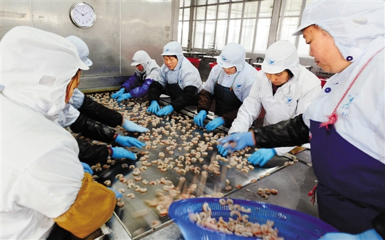 省级渔农业龙头企业之一的舟山市越洋食品有限公司车间内,工人们正忙着加工准备出口欧洲的单冻红虾仁。