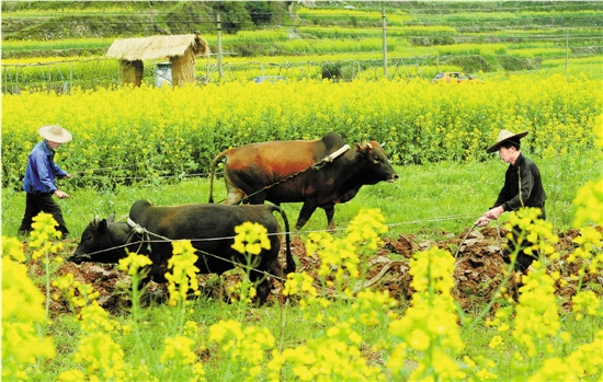 4月5日,武义县新宅镇大莱村村民在扶犁翻耕梯田,广袤田野一片繁忙景象。当日是二十四节气中的清明,江南地区气候湿润,正是春播好时节。 张建成 摄
