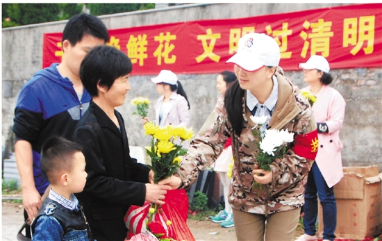 4月5日一早,温岭市城南镇妇联组织志愿者开展鲜花换纸钱活动,将鲜花免费发放到上山扫墓祭奠的群众手中,引导大家树立文明祭奠新风尚。