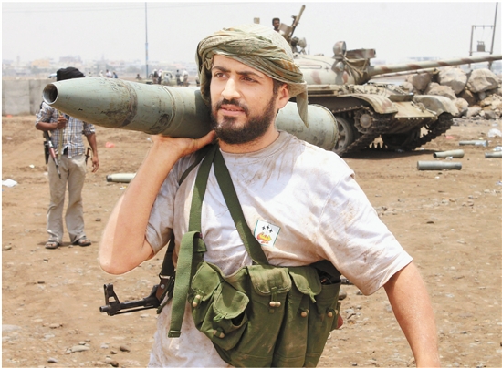 4月6日,在也门南部最大城市亚丁,一名“南方运动”武装人员运送坦克炮弹。 新华社发