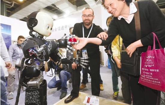 4月23日,参观者与展出的机器人互动。当日,以“创新驱动发展,保护知识产权,促进技术贸易”为主题的第三届中国(上海)国际技术进出口交易会在上海世博展览馆开幕,预计观众将超3万人次。 新华社记者 丁汀 摄