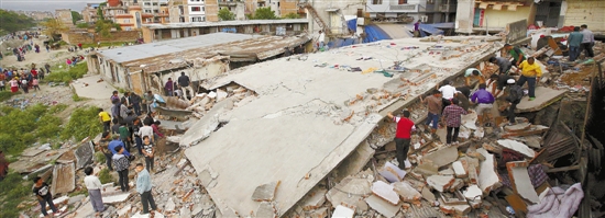 4月25日,在尼泊尔加德满都,人们聚集在倒塌的建筑旁。