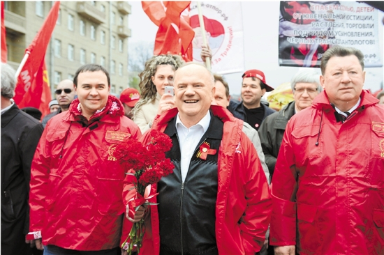 5月1日,在俄罗斯首都莫斯科,俄罗斯联邦共产党中央委员会主席久加诺夫(中)参加五一劳动节游行。当日,俄罗斯共产党在莫斯科市中心举行五一劳动节游行,近千人参加此次游行。 新华社记者 戴天放 摄