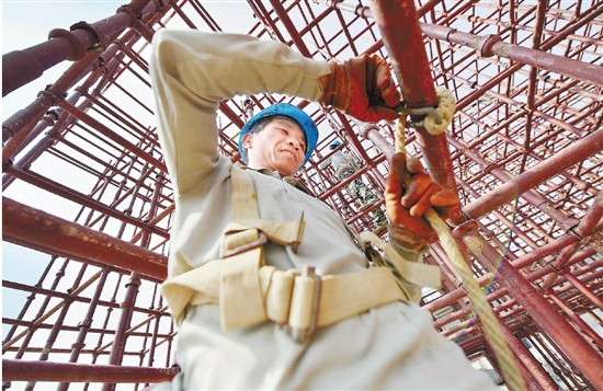 5月1日,绍兴市104国道柯桥段高架改建工程工地,施工人员在为高架浇筑桥梁板做准备。 柯桥日报记者 高洁 摄