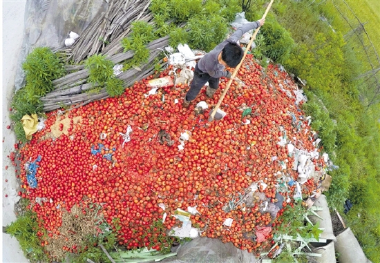 因气温上升,烂在路边的番茄开始发酸、发臭,一种植户将它们掩埋。