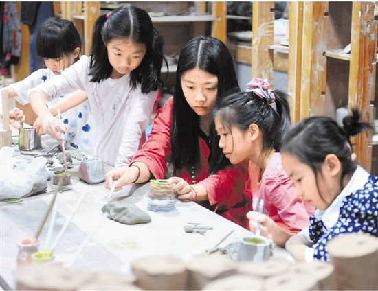 5月2日,假期里的杭州小学生跟着中国美术学院的大姐姐专心学习陶艺。
