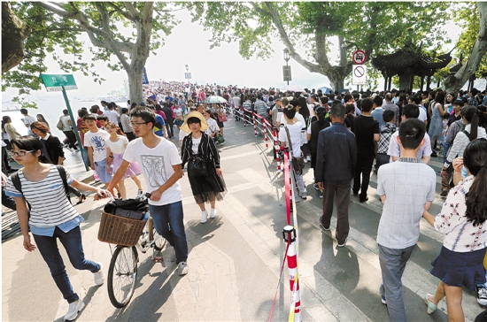5月1日,在西湖断桥,游客按照警戒线分流,游览秩序良好。