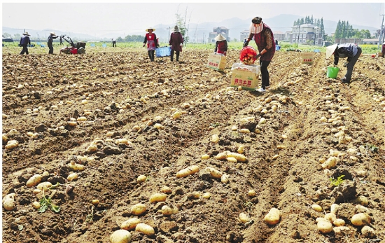 5月2日,在诸暨市街亭徐镇新联合村,农户种植的120亩荷兰15土豆开始采收。经田间现场测产,基地内土豆平均亩产超过3250公斤。 徐德文 徐锋 摄