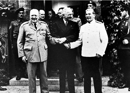 图为斯大林(前右)、杜鲁门(中)和丘吉尔在波茨坦握手。 新华社发