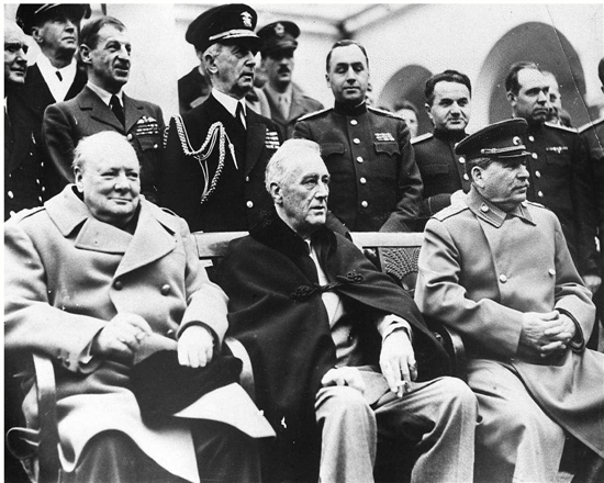 这是1945年2月4日,英国首相丘吉尔、美国总统罗斯福、苏联领导人斯大林(前排由左至右)出席雅尔塔会议的资料照片。 新华社发