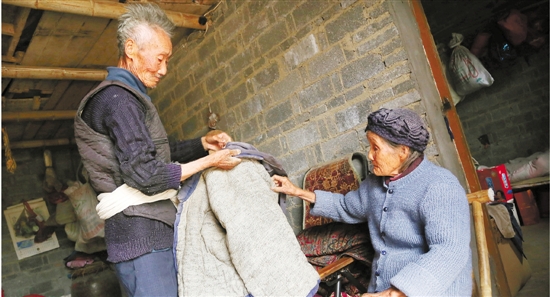 刘奶奶发现黄大爷棉衣有块地方破了,准备缝上。