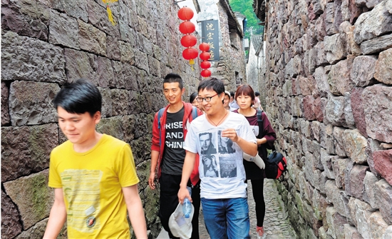 游客来到大岚镇柿林村参观古色古香的民居群。红色旅游热带动了村民通过兴办农家乐致富。