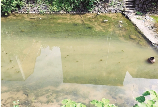 四明江大屋村河段堰坝上游水体黄绿浑浊,发出恶臭。 江晨 摄