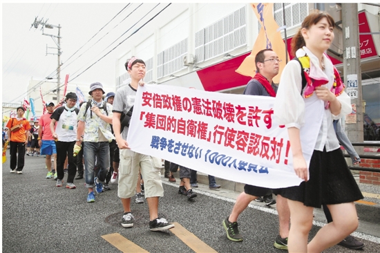 5月16日,在日本冲绳县宜野湾市,抗议者手持“不允许安倍政权破坏宪法,反对行使集体自卫权”的标语参加游行。来自日本全国各地的数千名民众当日聚集到美军普天间基地所在的冲绳县宜野湾市,举行游行集会,反对安倍政府对冲绳的暴政,要求美军立即归还普天间基地并放弃在冲绳边野古新建美军基地。