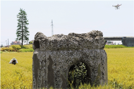 位于嘉善县干窑镇范泾村的一座碉堡,曾是中国军队为扼守交通要道而修筑的工事。在大炼钢铁的年代里,它坚硬的混凝土被敲破,里面的钢筋被抽出。