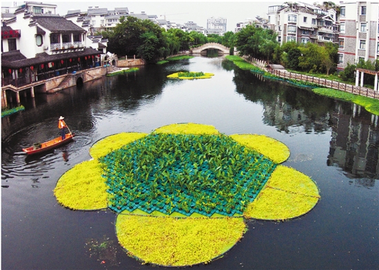 ◀吴兴区在河面上铺设浮岛,种植鸢尾、美人蕉、睡莲、圆币草等水生植物,通过植物根系的吸附作用,抑制水体富营养化。