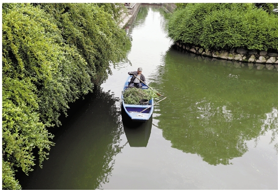 ▲龙游莲湖溪方门街段的河道管护员袁南京是老党员。他自掏腰包护溪水,前后已花费万余元。如今河段水清岸绿,风光旖旎。他每天划着自费购置的这条船,把各种杂物清理干净。 本报记者 储永志 县委报道组 蓝正伟 摄