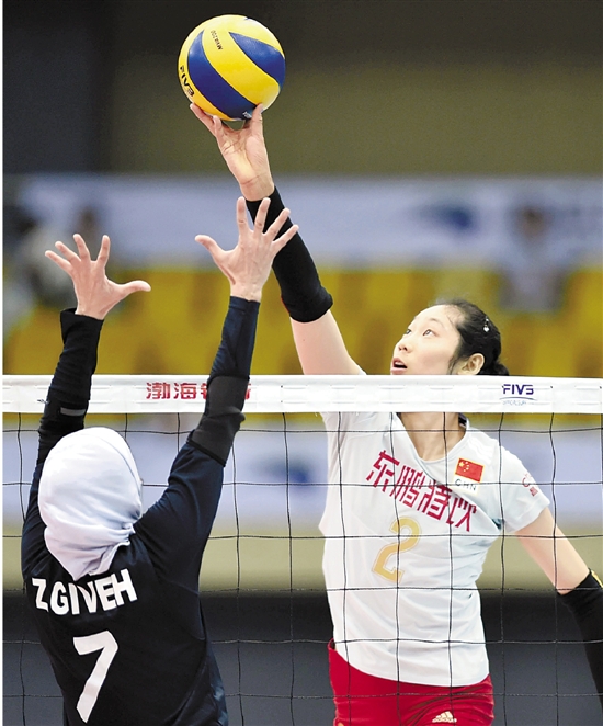 5月22日,在天津体育馆进行的2015年亚洲女子排球锦标赛A组比赛中,中国队以3比0战胜伊朗队。图为中国队球员朱婷(右)在比赛中吊球。 新华社发