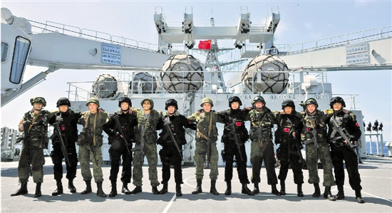 5月20日,中俄“海上联合-2015(I)”军事演习进入保证航运安全联合行动演练阶段,中俄双方特战队员合影。 新华社发 (熊利兵摄)