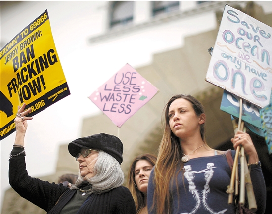 美国加州圣巴巴拉县里菲吉欧海滩一地下输油管道19日破裂,导致2.1万加仑(约7.9万升)原油泄漏并流入大海,污染当地海岸。图为21日,美国加州圣巴巴拉,示威者手持标语参加游行,呼吁禁止实施水力压裂法并逐步停止石油开采。