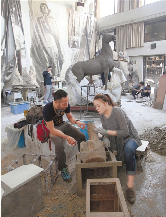 巧克力在中国美术学院雕塑工作室为中国同学制作的木雕作品提建议。