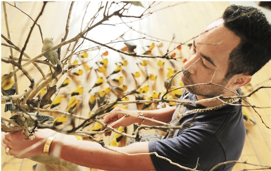巧克力把他的200多只鸟和其他木雕作品整合成一个综合雕塑。