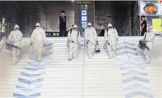 6月11日,在韩国首尔,全副武装的工作人员在地铁站消毒。 新华社发