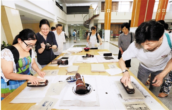 6月13日,浙江省图书馆举办中国传统印刷技术体验活动。图为市民在体验古籍雕版印刷和碑刻拓印。 本报记者 林云龙 摄