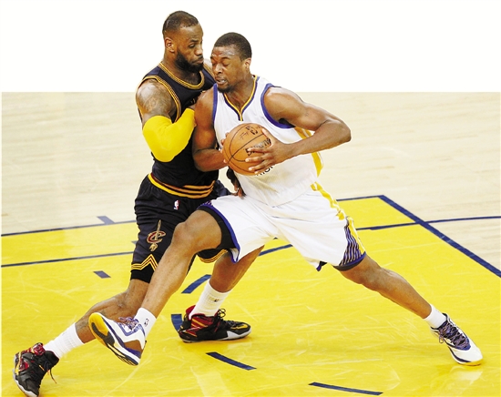 6月14日,骑士队球员勒布朗·詹姆斯(左)在比赛中防守勇士队球员巴恩斯。 新华社发