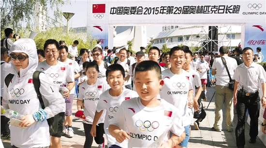 6月20日,由中国奥委会、北京2022年冬奥会申办委员会主办的第29届奥林匹克日长跑活动在北京、厦门、成都、合肥等11座城市同时举行。图为参加跑步活动的市民在北京活动开始后出发。 新华社发
