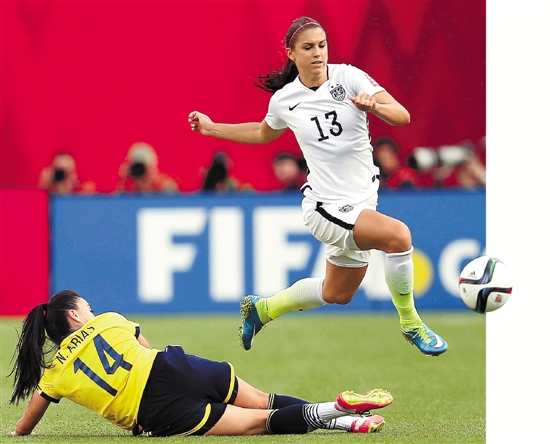 6月22日,美国队球员摩根(右)与哥伦比亚球员阿里亚斯拼抢。