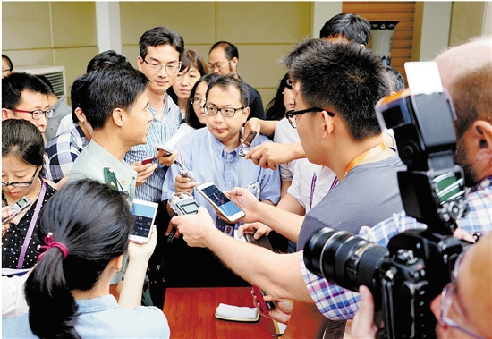 6月23日,中外记者在发布会结束后采访阅兵领导小组办公室副主任、总参作战部副部长曲睿。 新华社发