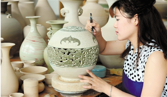 工艺师在生坯上雕镂花纹。