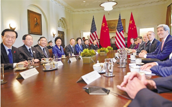 6月24日,在美国首都华盛顿白宫,美国总统奥巴马(右二)会见出席第七轮中美战略与经济对话和第六轮中美人文交流高层磋商的习近平主席特别代表国务院副总理刘延东(左四)、国务院副总理汪洋(左三)、国务委员杨洁篪(左五)等中方代表团主要成员。 新华社记者 殷博古 摄