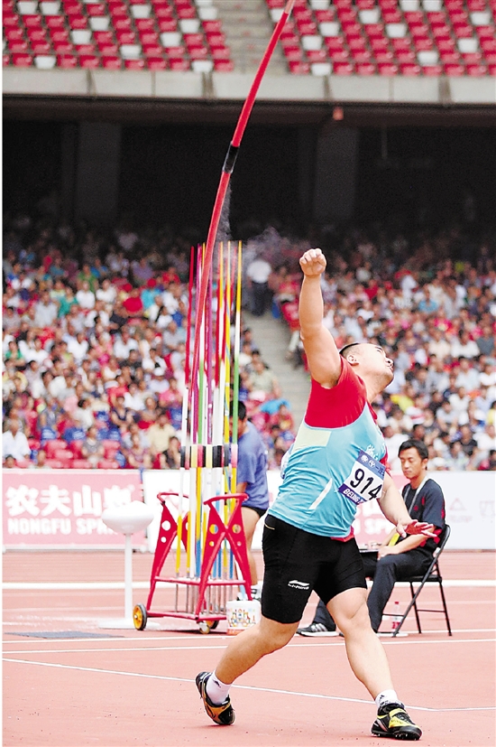6月29日,2015全国田径冠军赛暨大奖赛总决赛进入最后一天的争夺。浙江队选手孙建军在男子标枪决赛中以71米48的成绩夺得冠军。 新华社发