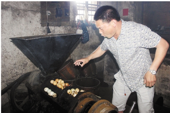 武义俞源乡俞源村村民俞友强正在加工“菜油蛋”,在武义,农忙时节有吃“菜油蛋”补身体的习俗。把鸡蛋、鸭蛋放进榨油机的槽里,榨油机开动的热量通过槽形成高温,把鸡蛋烘熟,也让鸡蛋充满了菜油的香气。 王东方 摄