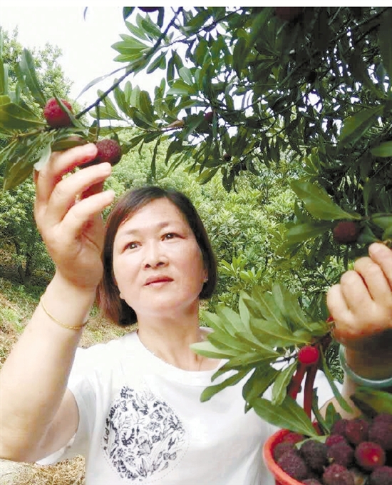 在白泉镇金山社区,游客正在采摘杨梅。 翁杰 摄