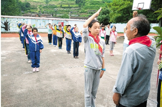 6月29日,丽水云和县最偏远的黄源小学邀请入党33年的刘明乾,给学生们讲革命故事。活动中,少先队员代表还给刘爷爷佩戴鲜艳的红领巾。 通讯员 项宗义 摄