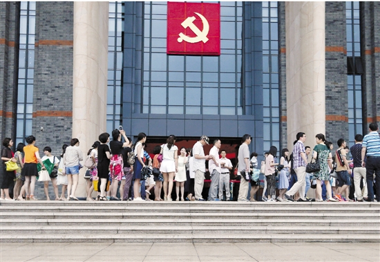 近日,到嘉兴南湖革命纪念馆参观学习的游客络绎不绝。 记者 储永志 沈志成 摄